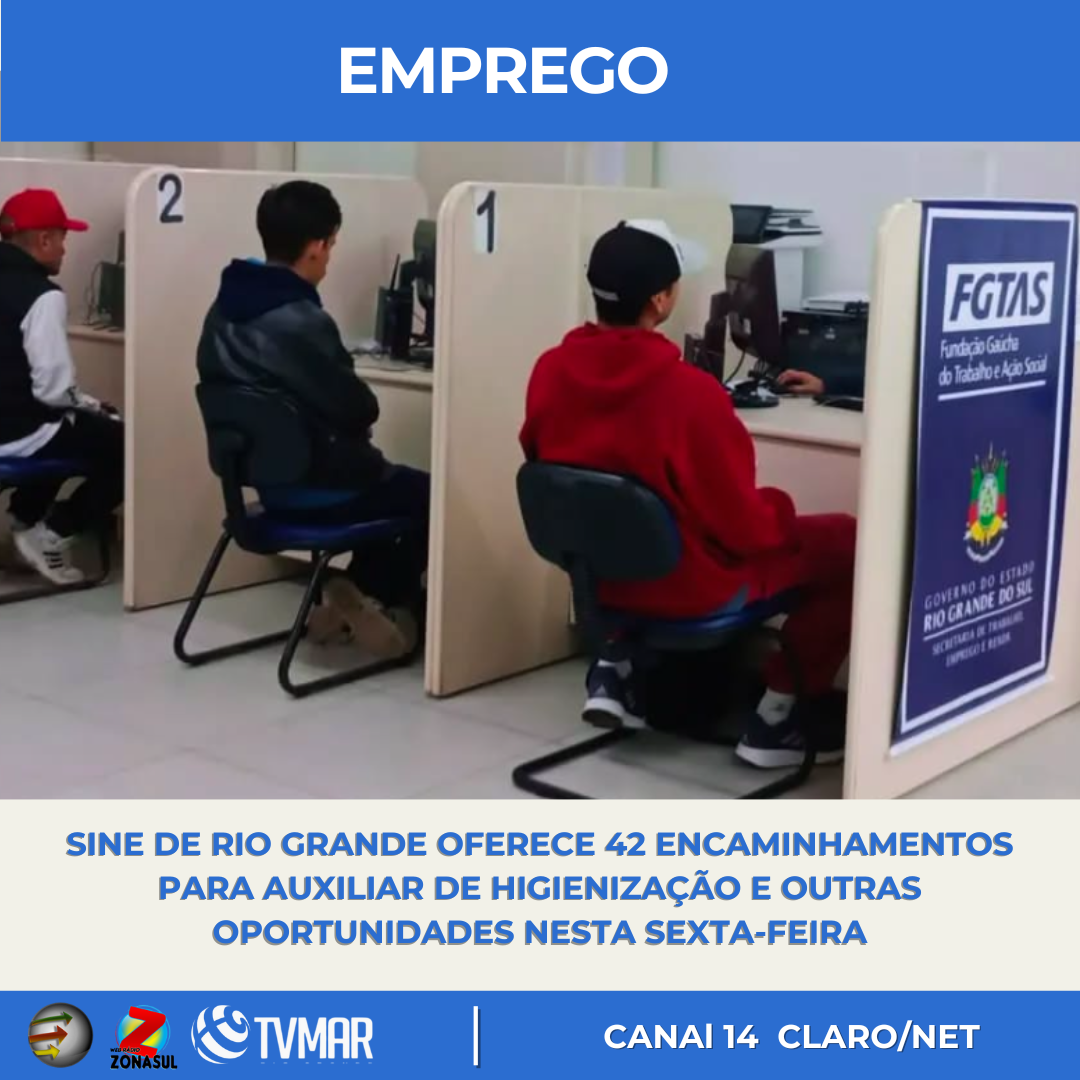 Sine de Rio Grande oferece 42 encaminhamentos para Auxiliar de Higienização e outras oportunidades nesta sexta-feira